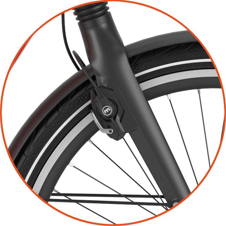 Piasta planetarna Shimano Nexus 8. W tylnej piaście znajduje się 8 biegowa planetarna piasta Shimano Nexus 8, która idealnie spełni swoje zadanie podczas jazdy w mieście oraz na dłuższych wycieczkach w zróżnicowanym terenie. 308% zakresu przełożeń daje nam możliwość bardzo szybkiej jazdy po prostej do granicy kadencji ok 45 km/h, a najniższe biegi pozwolą spokojnie wjechać pod górę o nachyleniu do 20°. Największą zaletą biegów w piaście jest długowieczność, mechanizm planetarnych zębatek działa w środowisku zamkniętym, chronionym przed piaskiem, kurzem i warunkami atmosferycznymi. W mieście docenimy możliwość zmiany biegów na postoju, w czasie postoju na światłach spokojnie możemy zmieniać biegi i ruszyć z lekkiego biegu pierwszego.