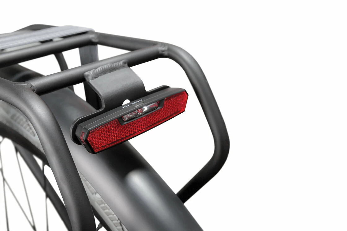 Tylna lampka rowerowa AXA Juno Steady, to bardzo kompaktowa tylna lampka. Inteligentna konstrukcja zapewnia również światło z boku, dzięki czemu jesteś lepiej widoczny dla ruchu ulicznego. Dodatkowym środkiem bezpieczeństwa jest zintegrowana funkcja stałego światła, która zapewnia kolejne 4 minuty światła podczas postoju. Praktyczne połączenia wciskane sprawiają, że lampkę można łatwo podłączyć zarówno do dynama z biegiem bocznym, jak i do piasty. Poza tym tylne światło jest również kompatybilne z akumulatorem do roweru elektrycznego 6V. Rozstaw montażowy wynosi 50 mm i 80 mm.