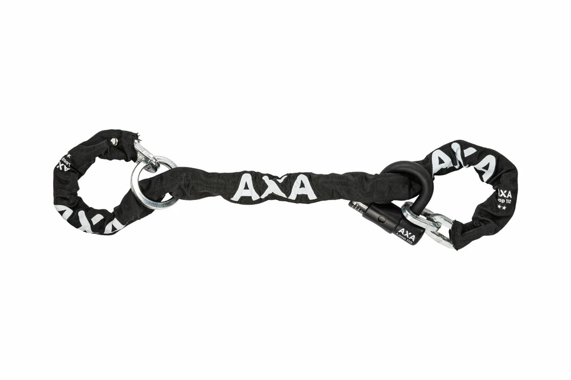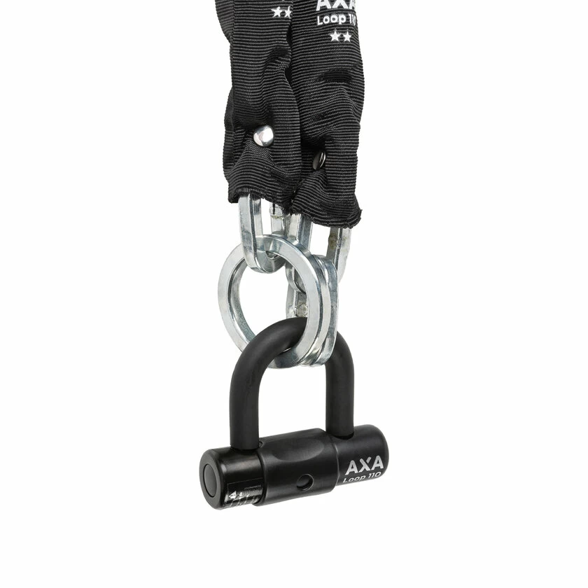 AXA loop 110 łańcuch przeznaczony do zabezpieczenia drogich, elektrycznych rowerów. Odporność zabezpieczenia została potwierdzona homologacją ART 2. Cylinder został zabezpieczony osłoną, dzięki czemu brud i wilgoć nie maja dostępu do wkładki, wydłużając żywotność łańcucha. Poliestrowy, czarny rękaw na łańcuch ma za zadanie ochraniać lakier pojazdu przed uszkodzeniem. Sam łańcuch można wykorzystać na dwa sposoby. Opcja 1 to zwykły „podwójny” sposób, mocujemy łańcuch wokół słupa i blokujemy go kłódką. 2 opcją jest przełożenie łańcuszka przez oczko łańcuszka i wykonanie krótkiej pętli. W ten sposób możesz zmaksymalizować długość zabezpieczenia. Zapięcie Loop ma długość 110 cm, ogniwa wykonane są z hartowanej stali i mają średnicę 9,5 mm. Zapięcie Loop posiada 15 na 15 punktów w skali bezpieczeństwa AXA.