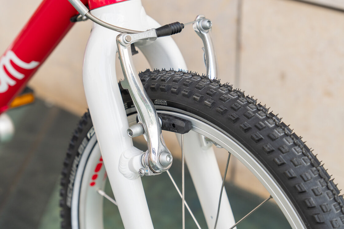 Opony Schwalbe LITTLE JOE Perf 16 x 1,5” o niskich oporach toczenia, doskonałej przyczepności i amortyzacji. Obręcze w rowerku dziecięcym woom 3 zostały wykonane z lekkiego aluminium. Dzięki zastosowaniu wąskich piast oraz śrub montażowych na klucz typu imbus zminimalizowano ryzyko otarcia lub rozcięcia skóry na nogach od ostrych krawędzi. Obręcze zostały wyposażone w 16 szprych Niro o grubości 1,8 mm. Wewnątrz opony znajduje się klasyczna dętka posiadająca wentyl samochodowy.