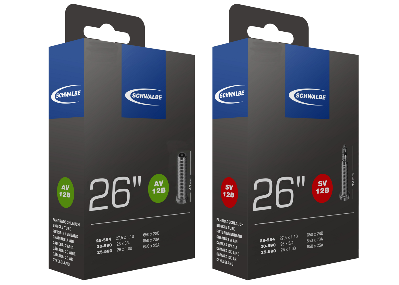 Dętka Schwalbe 12B o rozmiarze 26". Do wyboru różne rodzaje wentyla: