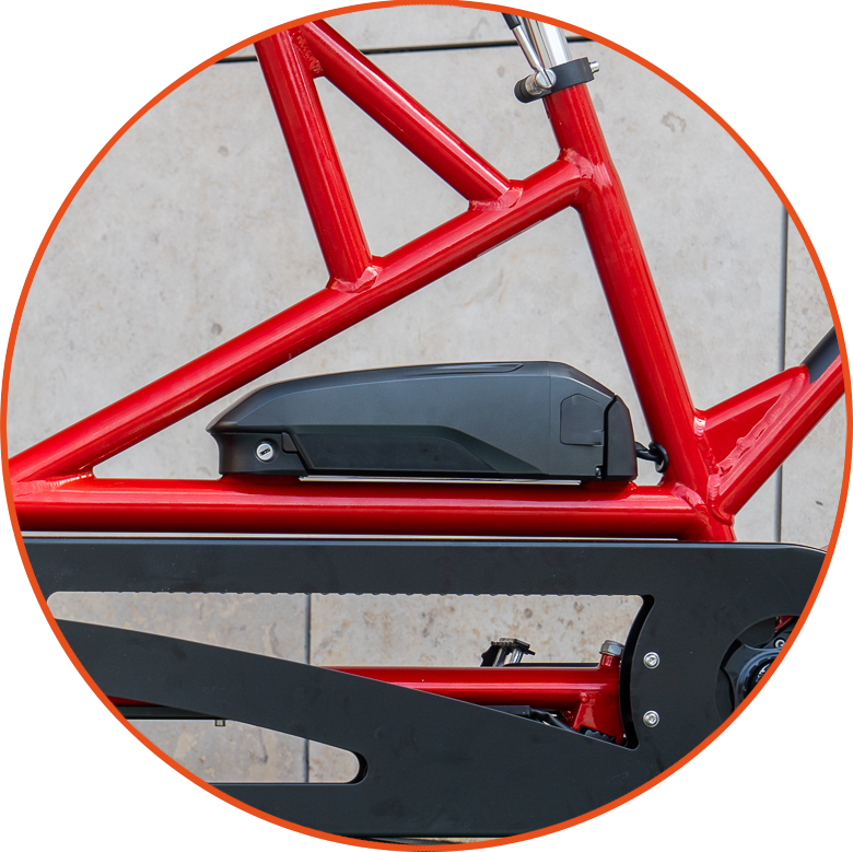 Bateria na ramie Shimano Steps 504 Wh to wysokowydajny akumulator litowo-jonowy, zapewniający zasięg do 80 km w trybie ECO (przy łącznej masie 100 kg na płaskim terenie). Odznacza się wyjątkową trwałością – zachowuje co najmniej 60% swojej pojemności nawet po 1000 pełnych cyklach ładowania. Dzięki nowej ładowarce Shimano, proces ładowania jest niezwykle szybki: osiągnięcie 80% pojemności zajmuje około 2,5 godziny, a pełne naładowanie (0-100%) trwa 4 do 4,5 godziny. Bateria posiada zintegrowany port, co pozwala na ładowanie bez konieczności jej demontażu z roweru. Jest w pełni odporna na warunki pogodowe i wstrząsy (standard IPX5), a jej masa wynosi około 2,6 kg, co zapewnia optymalne wyważenie tandemowego roweru.