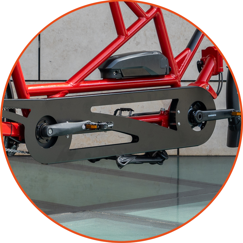 Pełna, aluminiowa, lakierowana osłona łańcuchaW przeciwieństwie do tanich, plastikowych osłon, w tym tandemie zastosowano osłonę wykonaną z lakierowanego aluminium. Jest znacznie bardziej odporna na pęknięcia i uderzenia, co w przypadku długiego roweru (narażonego na obicia podczas transportu czy składania) jest kluczowe. Osłona jest malowana proszkowo, co nie tylko świetnie wygląda, ale też trwale chroni materiał przed utlenianiem i trudnymi warunkami pogodowymi. Aluminiowa konstrukcja nie „pracuje” i nie wpada w wibracje tak jak plastik, co zapewnia cichszą jazdę nawet przy dużych obciążeniach generowanych przez silnik 85 Nm.