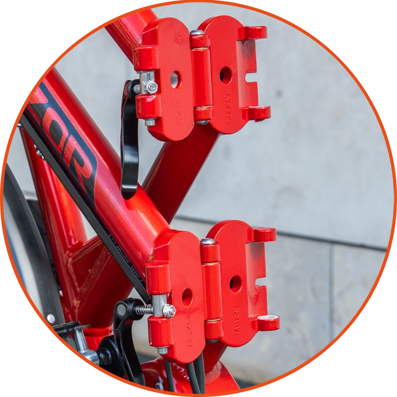 Pancerny system składania ramy Azor EM Vouw Tandem to majstersztyk inżynierii, zaprojektowany z myślą o maksymalnej sztywności konstrukcji przy jednoczesnej łatwości obsługi. Wzmocniony zawias zintegrowany z ramą, obsługiwany przez dwustopniowy mechanizm ryglowania. Dzięki zastosowaniu szerokiej powierzchni styku obu części ramy, po zamknięciu konstrukcja zachowuje się jak jednolity profil, co jest kluczowe w tandemie przenoszącym potężny moment obrotowy 85 Nm z silnika EP6. Intuicyjna dźwignia posiada dodatkową blokadę zabezpieczającą przed przypadkowym otwarciem w trakcie jazdy. System pozwala na szybkie złożenie roweru "na pół", co drastycznie ułatwia transport tandemu w samochodzie (np. na bagażniku typu Twinny Load) lub przechowywanie go w wąskich korytarzach. Zastosowane łożyskowanie w punkcie obrotu gwarantuje płynną pracę mechanizmu przez lata, nawet przy częstym składaniu roweru w trudnych warunkach pogodowych.