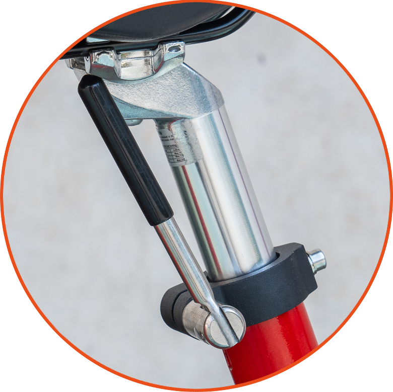 System szybkiej regulacji siodełek. Rower posiada wytrzymałe zaciski typu Quick-Release, które pozwalają na błyskawiczną, beznarzędziową regulację wysokości obu sztyc podsiodłowych. Dzięki temu w kilka sekund dostosujesz pozycję kierowcy i pasażera do ich wzrostu, co jest niezbędne dla zachowania optymalnej wydajności pedałowania przy silniku o momencie 85 Nm. Solidne dźwignie gwarantują, że siodełka pozostaną stabilne nawet pod dużym obciążeniem, a ich obsługa jest intuicyjna i nie wymaga dużej siły fizycznej.