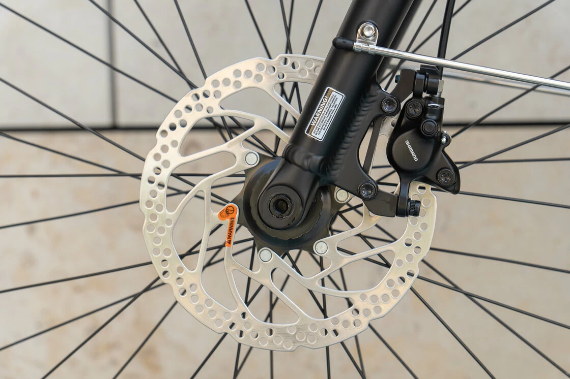 Hydrauliczne hamulce tarczowe Shimano MT200. O Twoje bezpieczeństwo zadba niezawodny system hamulców hydraulicznych Shimano MT200 o zwiększonej mocy hamowania. Tarcze hamulcowe o średnicy 160mm idealnie spełnią swoje zadanie w warunkach miejskich oraz w terenie pagórkowatym. Ceramiczne klocki hamulcowe gwarantuję efektywne hamowanie w każdych warunkach atmosferycznych.