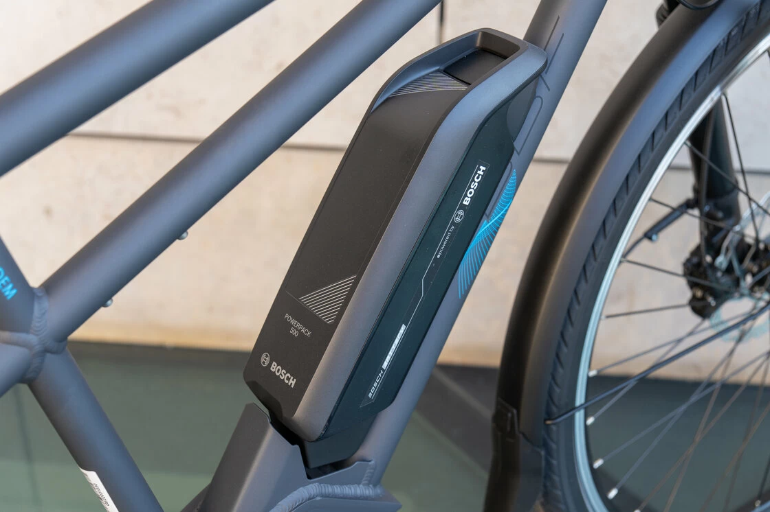 Bateria Bosch 500Wh na ramie. Bateria litowo-jonowa o pojemności do wyboru 300/400/500Wh zamontowana na ramie roweru. W pełni zabezpieczone zamkiem Trelock otwieranym kluczem z blokady tylnego koła Trelock. Zasięg 30-150 km - 110 km to maksymalny zasięg roweru w trybie ECO podczas jazdy w terenie lekko pagórkowatym, przy jeździe ze średnią prędkością ok 25 km/h, z lekkim przeciwnym wiatrem, w temperaturze 10-20°C, używając odpowiednich biegów do aktualnej prędkości - dane dla osoby o wadze 70-80 kg. Minimalny zasięg roweru 45 km osiągniemy korzystając z opcji TURBO, podczas jazdy w terenie górzystym z dużą różnicą nachylenia terenu przy średniej prędkości 25 km/h, z mocnym wiatrem przeciwnym, w temperaturze poniżej 10°C - dane dla osoby o wadze powyżej 85 kg. Zintegrowany wskaźnik poziomu naładowania baterii, czas pełnego ładowania 3,5 h.