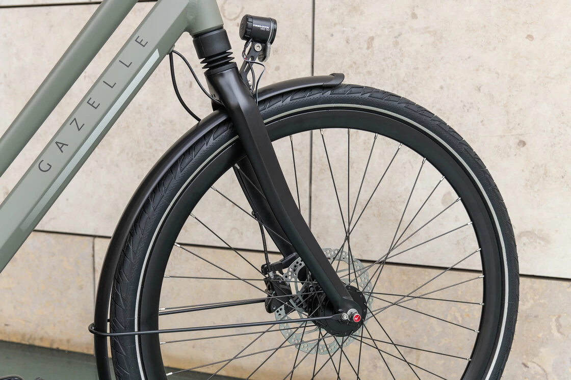 Przedni amortyzator Gazelle HeadShock. Elegancki amortyzator w pełni zintegrowany z widelcem i ściśle przylegający do główki ramy. Skok amortyzatora to ok 25mm co w warunkach miejskich i leśnych jest w zupełności wystarczającą wartością dla zapewnienia komfortu jazdy po dziurawych drogach. Ogromną zaletą amortyzatorów typu HeadShock jest zdecydowanie niższa waga oraz bardziej prestiżowy design w porównaniu ze standardowymi teleskopowymi amortyzatorami.