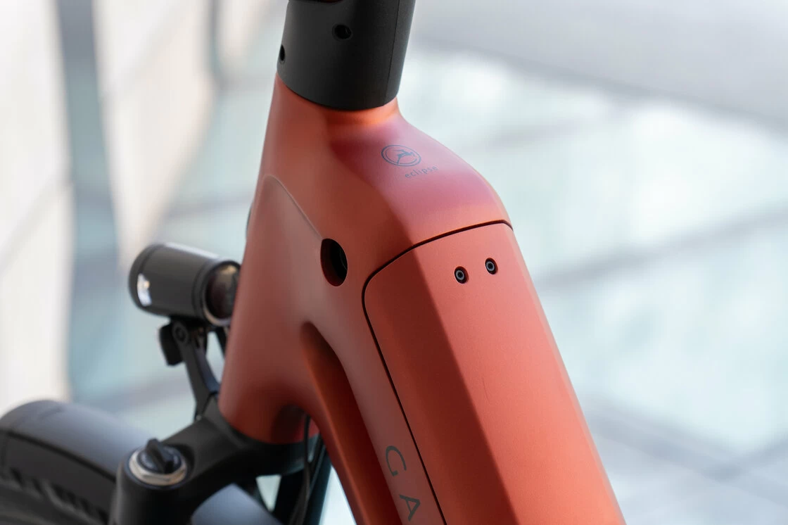 Rower elektryczny na pasku Gazelle Eclipse C380 HMB to holenderski przedstawiciel rowerów elektrycznych typu SUV czyli masywnego roweru o szerokich oponach, komfortowej pozycji za kierownicą i mocnym silniku elektrycznym. Silnik centralny Bosch Performance Line CX z maksymalnym momentem obrotowym 85 Nm pozwala bez wysiłku pokonywać nawet najbardziej strome wzniesienia. Silnik zasilany jest z akumulatora pięknie ukrytego w ramie. Jego pojemność 750 Wh jest wystarczająco duża, aby umożliwić długie przejażdżki ze wsparciem, bez konieczności ładowania przez wiele km. Wyjątkowo szerokie opony Schwalbe Marathon zapewniają kontrolę na każdym zakręcie – na asfalcie i drogach nieutwardzonych.  Solidny amortyzowany widelec Suntour Mobie amortyzuje nierówności, zapewniając optymalny komfort jazdy. Gazelle Eclipse to dbałość o design i integrację - Kultowy kolorowy mostek Gazelle w kształcie litery V zapewnia atrakcyjny wygląd oraz skrywa zintegrowany wyświetlacz Bosch Kiox 300.