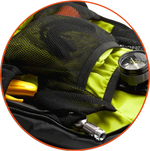 Plecak oferuje liczne kieszenie i przegrody, w tym miejsce na baterię do e-bike'a, bukłak oraz akcesoria, co zapewnia doskonałą organizację sprzętu