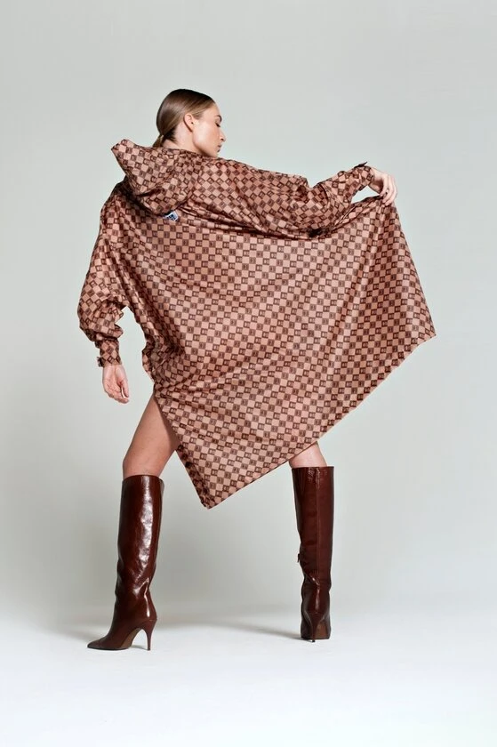 Ponczo rowerowe Rain Kiss Damierto wyjątkowe połączenie mody, elegancji i funkcjonalności, które doskonale sprawdzi się w deszczowe dni. Nazwa „Damier” pochodzi od francuskiego słowa oznaczającego szachownicę, a ten klasyczny wzór ma długą historię w świecie mody. Delikatne odcienie brązu i beżu, uzupełnione logo Rain Kiss w formie ust, nadają ponczu subtelnej i ponadczasowej elegancji z nutą paryskiego szyku. Wykonane z certyfikowanego, w 100% z pochodzącego z recyklingu poliestru, ponczo łączy troskę o środowisko z najwyższą jakością. Materiał o wodoodporności 7000 mm i uszczelnione szwy skutecznie chronią przed deszczem, zapewniając komfort w każdej pogodzie. Uniwersalny rozmiar, regulowane mankiety na rzepy oraz kaptur pozwalają na indywidualne dopasowanie, a boczne zapięcia na guziki sprawiają, że ponczo jest idealne także dla rowerzystów. Lekka konstrukcja (250 g) i możliwość złożenia do kompaktowego etui (31 x 33 x 2 cm) czynią je praktycznym i łatwym w transporcie. Rain Kiss Damier to esencja stylu i praktyczności.