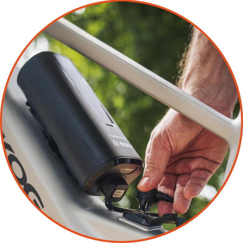 Bateria w ramie Bosch PowerTube 400Wh. Nowe zoptymalizowane baterie Bosch PowerTube całkowicie zintegrowane z ramą roweru. Bateria jest bardzo dobrze zabezpieczona nie wypadnie z obudowy nawet na wymagającym terenie. Nadal można go łatwo wyciągnąć. Po około 6 godzinach akumulator jest w pełni naładowany za pomocą szybkiej ładowarki 4 A (w zestawie), a 50%  naładowania jest osiągalne po 2 godziny. W pełni zabezpieczona zamkiem AXA otwieranym kluczem z blokady tylnego koła AXA. W zestawie z rowerem znajduje się szybka ładowarka Bosch 2A.