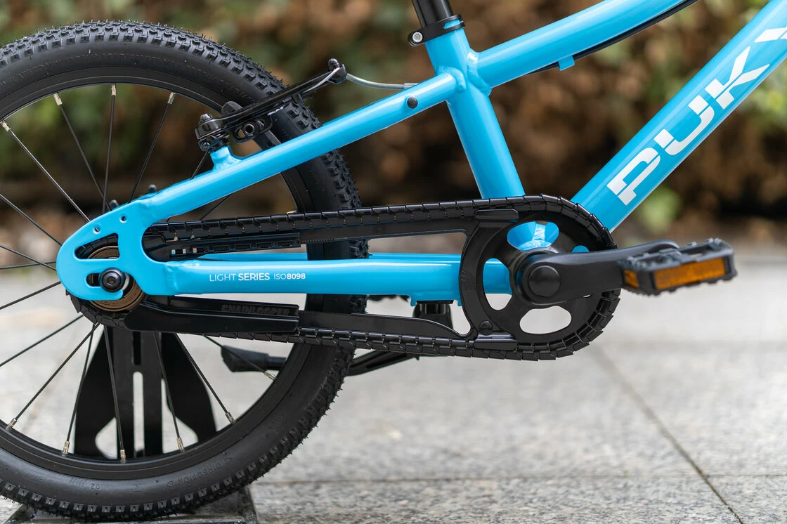 OSŁONA ŁAŃCUCHA. Lekki rower dziecięcy LS-PRO posiada najlepszą możliwą ochronę – osłonę na łańcuch firmy HEBIE. Obudowa jest całkowicie zamknięta i ma wąską konstrukcję. Dzięki osłonie HEBIE dodatkowo zaoszczędziliśmy na wadze rowerka dziecięcego. Jednocześnie, osłona spełnia wymagane prawem przepisy bezpieczeństwa. Przednia korba ma 28 zębów, a tylna zębatka 15. Długość ramienia korby to 102mm.