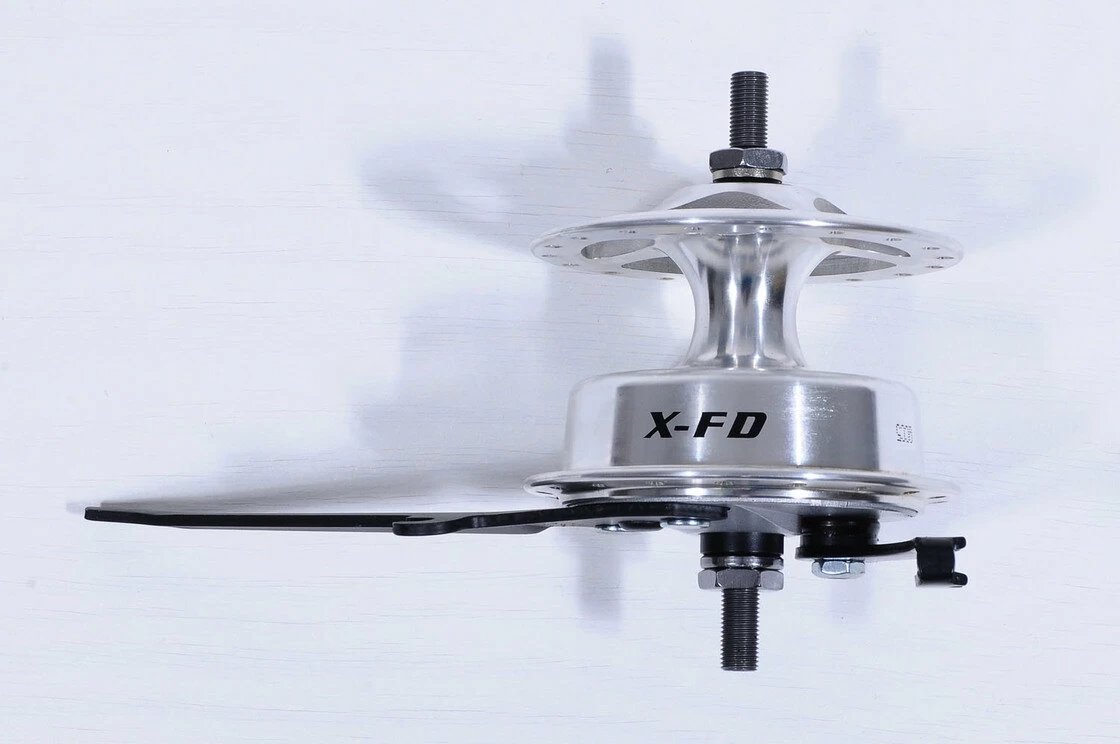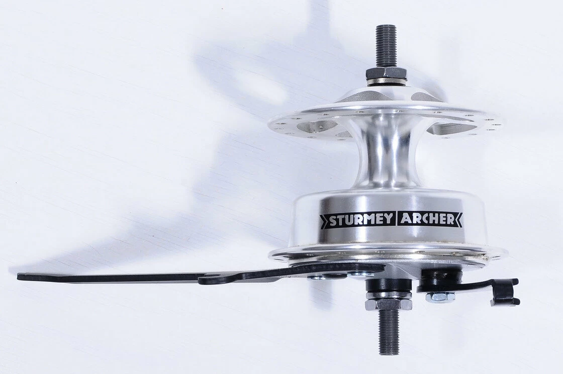 Przedni hamulec bębnowy Sturmey Archer X-FD Summit z okładzinami hamulcowymi o średnicy 70 mm. Obudowa wykonana w całości z aluminium.