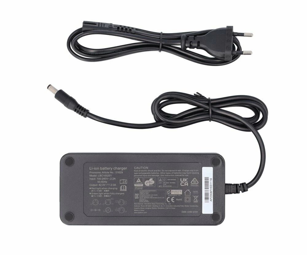 Oryginalna ładowarka do roweru elektrycznego Batavus Fuego/Mambo E-go z baterią w osłonie łańcucha. W zestawie specjalna nakładka do ładowania wyciągniętej baterii. Bez nakładki można ładować baterię podłączając ładowarkę do stacji dokującej sterownika na kierownicy.
