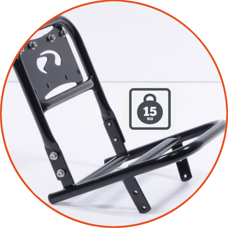 Bagażnik wykonany jest z 16 mm rurek pokrytych wytrzymałą proszkowaną warstwą, posiada hak na zamontowanie przedniego oświetlenia.
