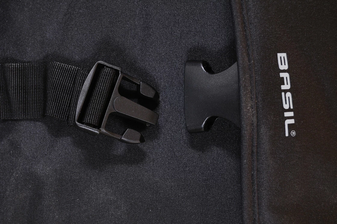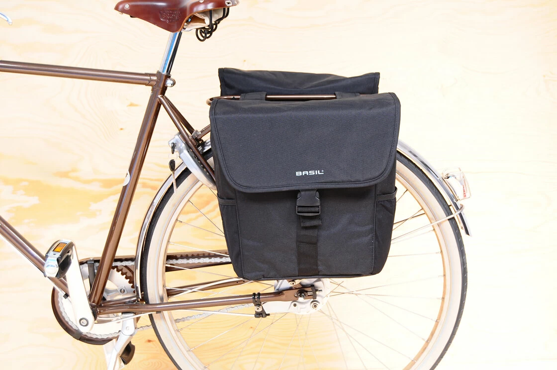 Sakwa rowerowa podwójna Basil Go Double-Bag uniwersalna torba na bagażnik wykonana z materiału o wysokiej gramaturze - mocna i odporna na zużycie. Mocowana na tylnym bagażniku za pomocą parcianych pasków ściągających. W pełni usztywniania dzięki czemu zachowuje swój kształt także gdy jest pusta. Dzięki odseparowanym pasom mocującym na bagażniku mamy pełny dostęp do gum na bagażniku.