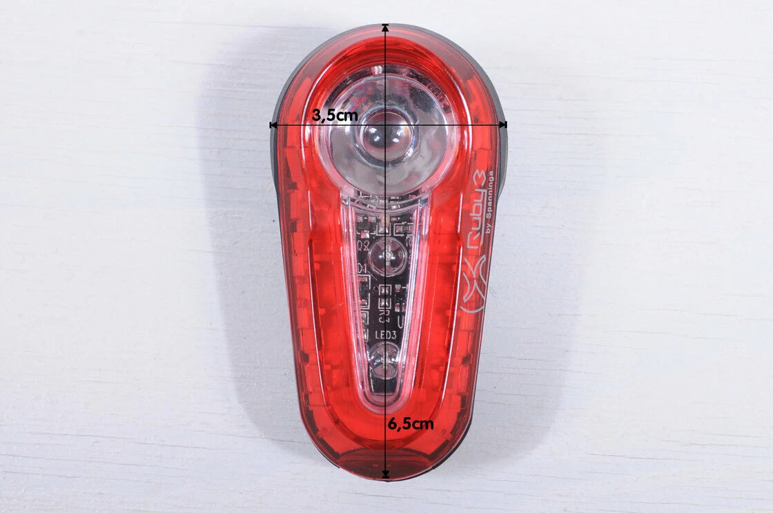 Tylna lampka rowerowa Spanninga Ruby 3 XB została wyposażona w 3 czerwone diody LED – jedna o mocy 0,5W oraz dwie standardowe. Zasilana jest poprzez 2 baterie AAA o napięciu 1,5V. Lampka generuje bardzo jasne światło, a dzięki kompaktowym rozmiarom oraz mocowaniu na klips lub gumową opaskę może być używana także na odzieży wierzchniej. Lampka posiada wskaźnik naładowania baterii. Lampka posiada certyfikat StVZO.