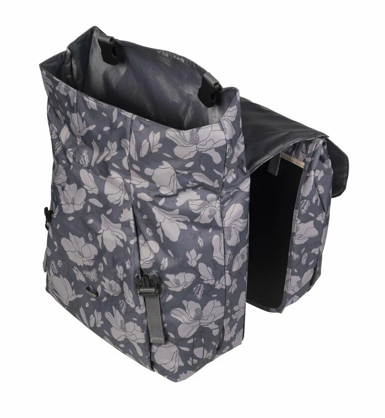 Podwójna sakwa rowerowa Basil Double Bag to produkt z serii kolorystycznej Magnolia charakteryzujący się najwyższą jakością. Sakwę charakteryzuje kompatybilność z bagażnikami z systemem Mick, Racktime oraz iRack/Carrymore, duża całkowita pojemność, specjalne miejsce na przypięcie lampki LED oraz plastikowy zatrzask zamykający sakwę. Double Bag, jak cała seria Magnolia, został wykonany z wodoodpornego poliestru w standardzie IPX 3 (przy normalnym deszczu materiał przesiąka dopiero po 24 godzinach), który skutecznie chroni zawartość przed zamoknięciem. Sakwa może być używana z klasycznymi rowerami oraz rowerami elektrycznymi.