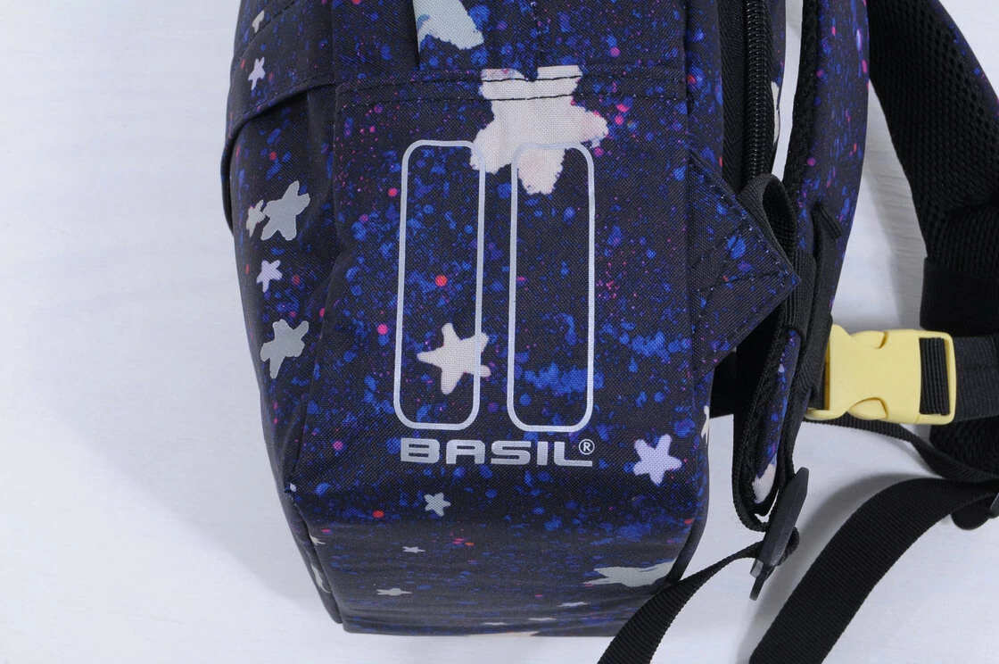 Rowerowy plecak dziecięcy Basil Stardust, poza wysokim komfortem podczas noszenia na plecach, oferuje możliwość przyczepienia go do bagażnika rowerowego za pomocą systemu Basil Hook-on. Plecak został wykonany z wodoodpornego poliestru, który zabezpiecza przewożone lub przenoszone rzeczy przed wodą. Duża wewnętrzna komora o pojemności 8 litrów pomieści większość najważniejszych rzeczy. Dodatkowa kieszeń pozwoli przechowywać rzeczy, z których często się korzysta i chce się do nich mieć szybki dostęp. Plecak posiada regulowane szelki. Gwiazdy na plecaku są wykonane z odblaskowego materiału, tak samo jak aplikacje na bokach.