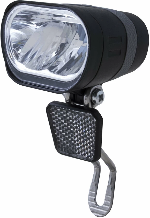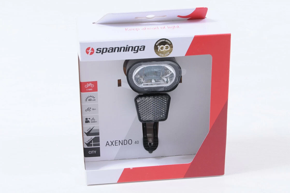 Przednia lampka rowerowa Spanninga Axendo 40 XDAS to lampka przeznaczona do użytku z rowerami elektrycznymi, których silniki generują napięcie od 6V do 36V. Lampka wyposażona została w jedną białą diodę LED, której moc wyjściowa wynosi 40 lux. Za odpowiednie rozprowadzenie światła odpowiada zastosowany reflektor, który potrafi skupić wiązkę światła nawet 20 metrów przed rowerem. Lampka zostały wyposażona w pasywny odblask, który dodatkowo zwiększa widoczność. Obudowa lampki została wykonana z solidnego aluminium. Lampka przeznaczona jest do montażu w otworze znajdującym się przednim widelcu.