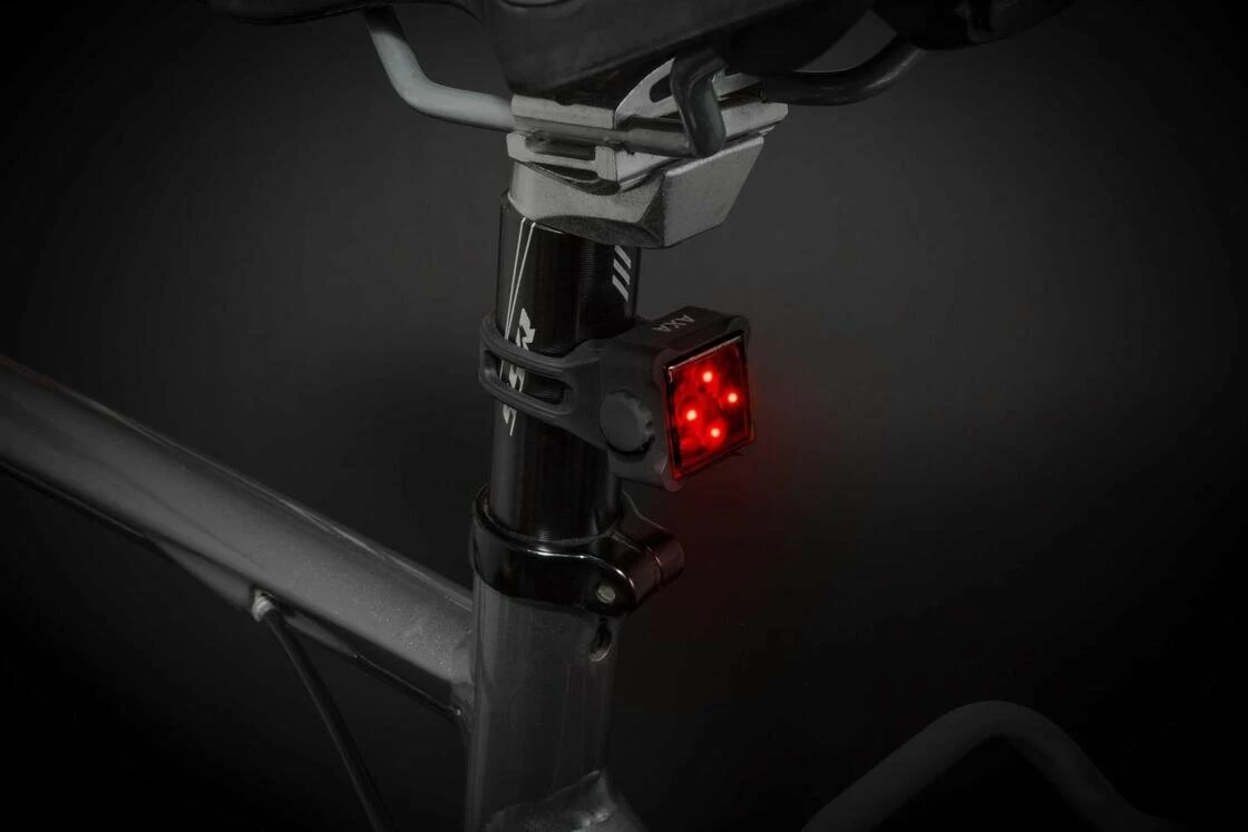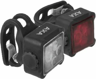 Zestaw lampek rowerowych AXA Niteline 44 R (USB) to dwie silikonowe lampki zapewniające widoczność po zmroku. Obie lampki wyposażone są w cztery mocne diody, z tą różnicą że przednia lampka posiada biała diodę, a tylna czerwoną. Obie lampki posiadają port USB przeznaczony do ładowania oraz wskaźnik rozładowujących się akumulatorów. Obie lampki posiadają cztery tryby pracy – Low Steady, High Steady, High Pulse oraz Low Flash. Montaż lampki odbywa poprzez silikonową opaskę, którą owija się wokół kierownicy lub sztycy siodełka. Czas pracy na jednym zestawie baterii wynosi do 6 godzin.